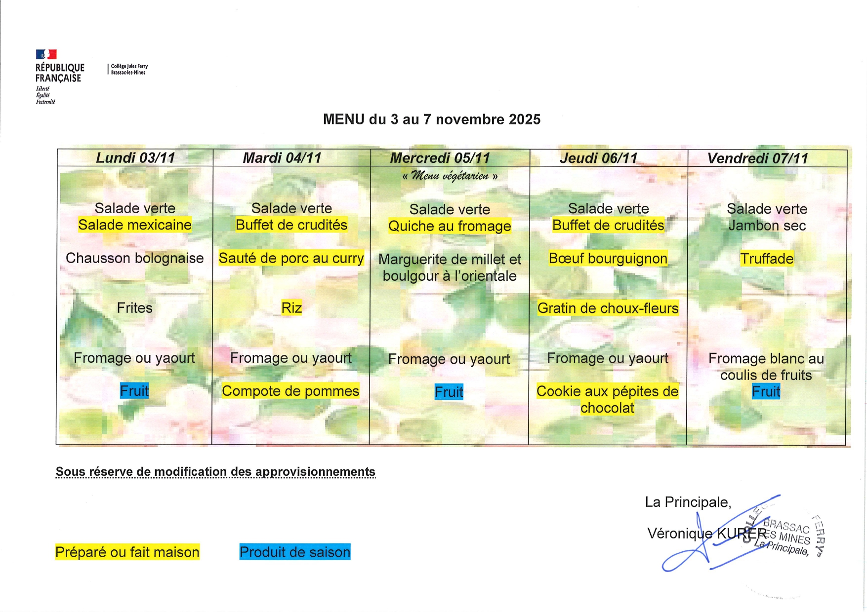 Menu du 3 au 7 novembre 2025